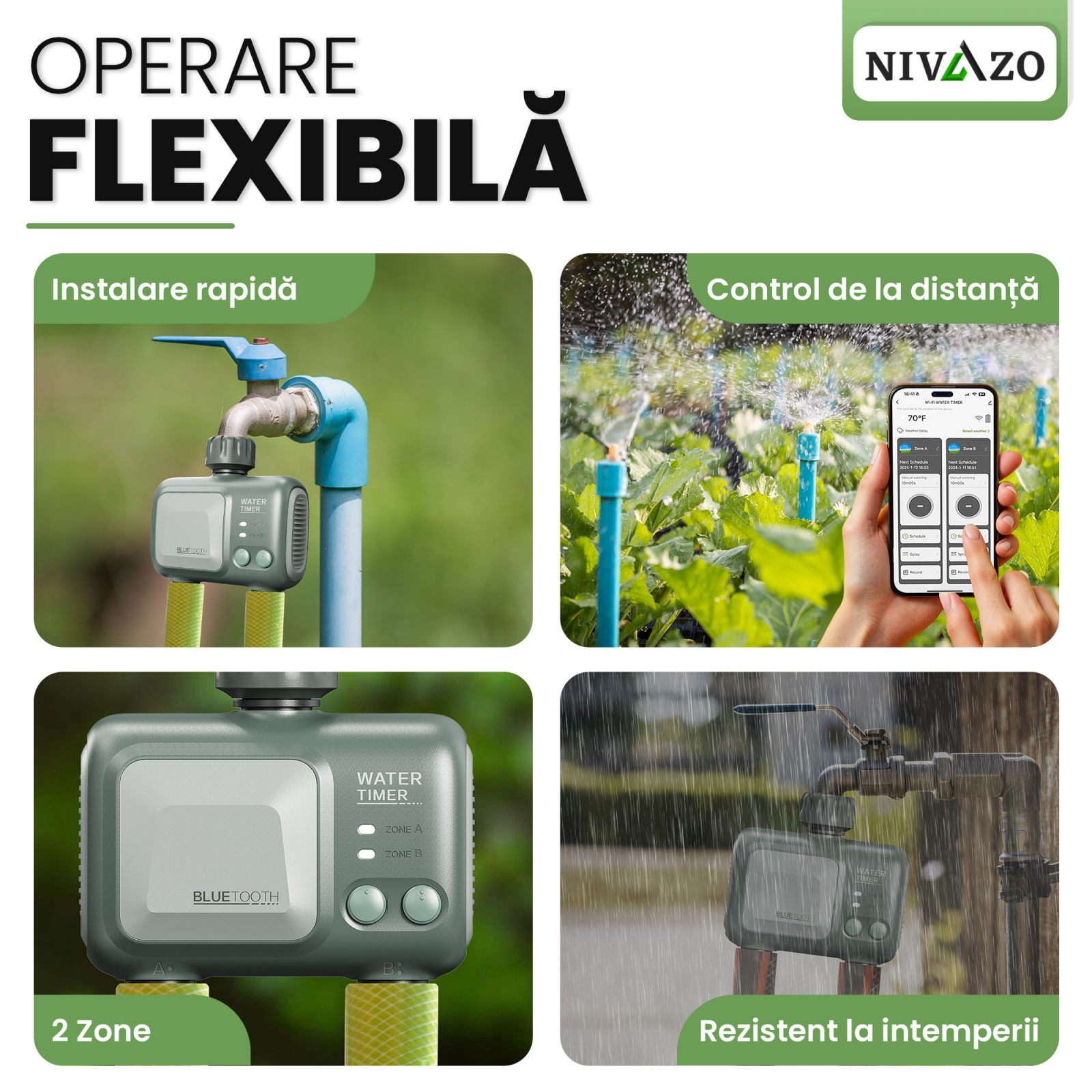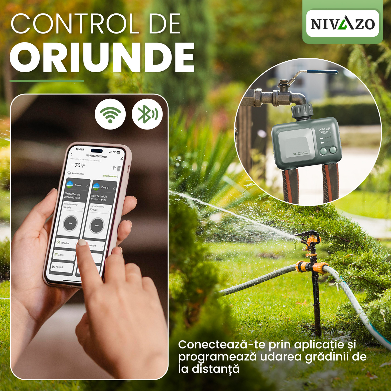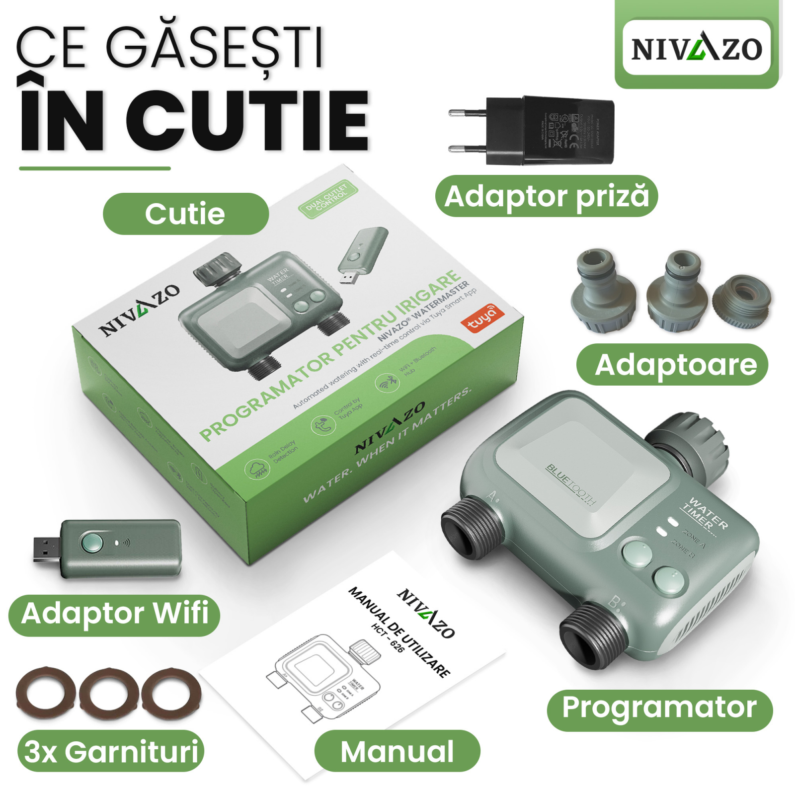 Functionalitati: Programare inteligenta, Durata de udare reglabila, Conexiune WiFi, Selectarea zilelor saptamanii si setarea exacta a orei si durata fiecarui ciclu de udare, App control (prin aplicatie mobila), Rezistent la apa si umiditate, Compatibil Tuya, Programare rapida, Protectie automata scurt-circuit, Calendar pe 7 zile, Electrovana programabila, Timp de pornire reglabil, Adaptor racord furtun de gradina A3/4